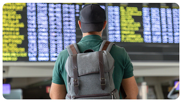 - People checking bags in airports, queuing, sitting in lounges, waiting to board planes.